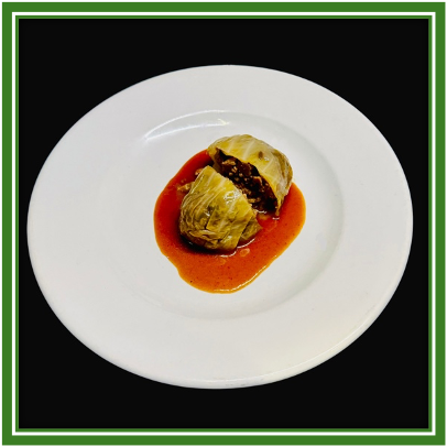 Heat the sauce in a saucepan. When it starts to simmer, whisk in 1 tablespoon of butter to emulsify the sauce. It will become shiny and silky. Coat the bottom of a preheated plate with sauce. Carefully place the stuffed cabbage ball in the center. Serve immediately.