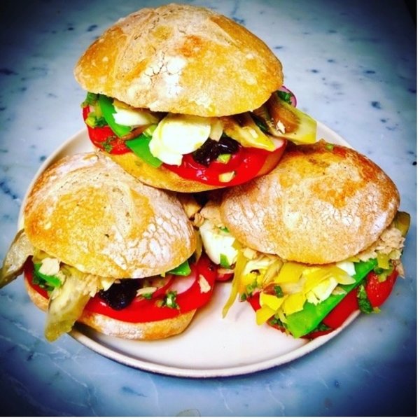 Pain Bagnat means dried bread or rancid bread in Provençal. It is of a very modest origin, since its appearance was brought about from poor housewives saving their old bread rather than throwing it out by soaking it in water to soften it and make a sandwich. A tomato was added and sometimes even fresh onions and garlic. Its contemporary version is made with a fresh round bread with all the elements of the classic Niçoise salad.
